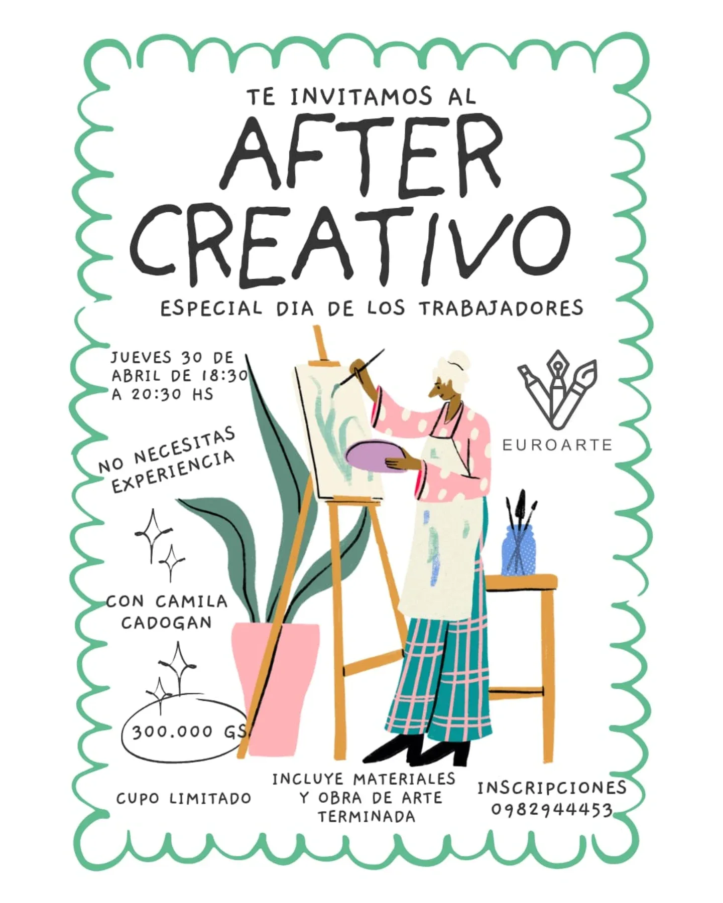 Este 30 de abril estamos haciendo un After Creativo especial Día del Trabajador en @euroarte_py en Asunción 🎨 Es un espacio pensado especialmente para personas que trabajan por su cuenta o en un emprendimiento y quieren regalarse una pausa ✨ 🖌️ No necesitás experiencia 🕯️ Incluye materiales + tu obra terminada 🪑 Cupos limitados Vamos a pintar “tu propio refugio”: un espacio para desconectar y disfrutar 💰 Inversión: 300.000 Gs 📍 Horario: 18:30 a 20:30 hs