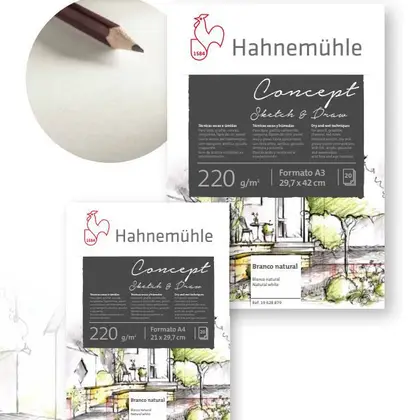 El bloc "Concept Sketch & Draw" ha sido especialmente desarrollado para estudiantes y universitarios y es la herramienta ideal para profesores de dibujo que buscan material de alta calidad para sus alumnos. El papel de 220 g/m² con una superficie ligeramente granulada es ideal para técnicas secas y húmedas. La combinación de técnicas y materiales aporta numerosas ventajas al proceso conceptual y creativo del dibujo. Tanto aprendices como profesionales que utilizan materiales de calidad para desarrollar sus proyectos consiguen resultados que destacan en el mercado. La superficie suave y el color blanco natural del bloc Concept Sketch & Draw se pueden utilizar por ambas caras y son muy resisentes a correcciones y retoques. Ideal para lápiz, grafito, carboncillo, sanguina, lápiz de color, pastel seco y al óleo, así como para técnicas húmedas como tinta, acrílico, gouache y acuarela. Disponible en tamaños A4 y A3. Libre de ácido y resistente al envejecimiento.