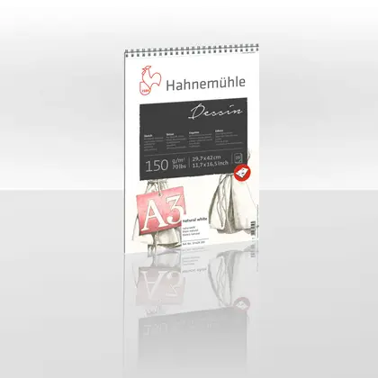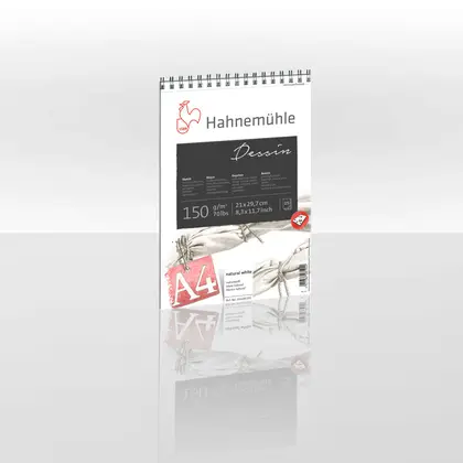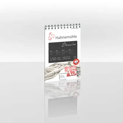 El papel tiene un tacto muy suave, pero un grano fino que garantiza una excelente transferencia de color. Su tono blanco natural garantiza un buen contraste y una alta intensidad de color. Los artistas que utilizan el papel para bocetos Hahnemühle Dessin destacan su capacidad de absorción, que evita que los pigmentos no fijados se destiñan. Los blocs encuadernados en espiral cuentan con microperforación, lo que permite retirar las hojas sin que se vean rasgaduras. Las hojas retiradas cumplen con el tamaño DIN especificado. Libre de ácido y resistente al envejecimiento.