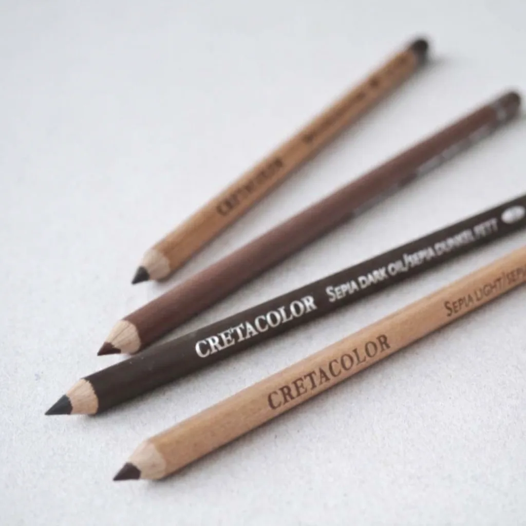 Los lápices sepia de Cretacolor se presentan en dos versiones distintas, cada una diseñada para satisfacer diferentes técnicas de dibujo. Estos lápices ofrecen una rica pigmentación que se traduce en tonos tierra cálidos, perfectos para una variedad de aplicaciones artísticas.Se clasifican en dos tipos según su aglutinante: Dry (Seco/Pastel): Este tipo proporciona una textura suave y una aplicación sencilla, permitiendo mezclar y difuminar los colores con facilidad. Es especialmente útil para crear matices sutiles y texturas. Oil (Óleo): Los lápices de óleo ofrecen una mayor intensidad y profundización de color. Su formulación permite una aplicación más rica y vibrante, ideal para trabajos que requieren un acabado más luminoso.Los tonos sepia son clásicos en el mundo del dibujo, ya que evocan una calidez natural y un sentido de atemporalidad. Son muy utilizados en retratos, donde aportan un matiz que complementa la piel, así como en paisajes que buscan reflejar la belleza terrosa de la naturaleza. Además, son perfectos para bocetos que requieren un estilo clásico y elegante.