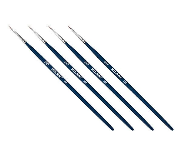 Serie 301 : Pincel de pelo sintético, redondo, virola de latón cromado sin soldaduras. mango corto barnizado color azul oscuro brillante.Pinceles para trabajos de pequeñas dimensiones en manualidades o modelismo.Gama con 6 números del 0 al 10/0.