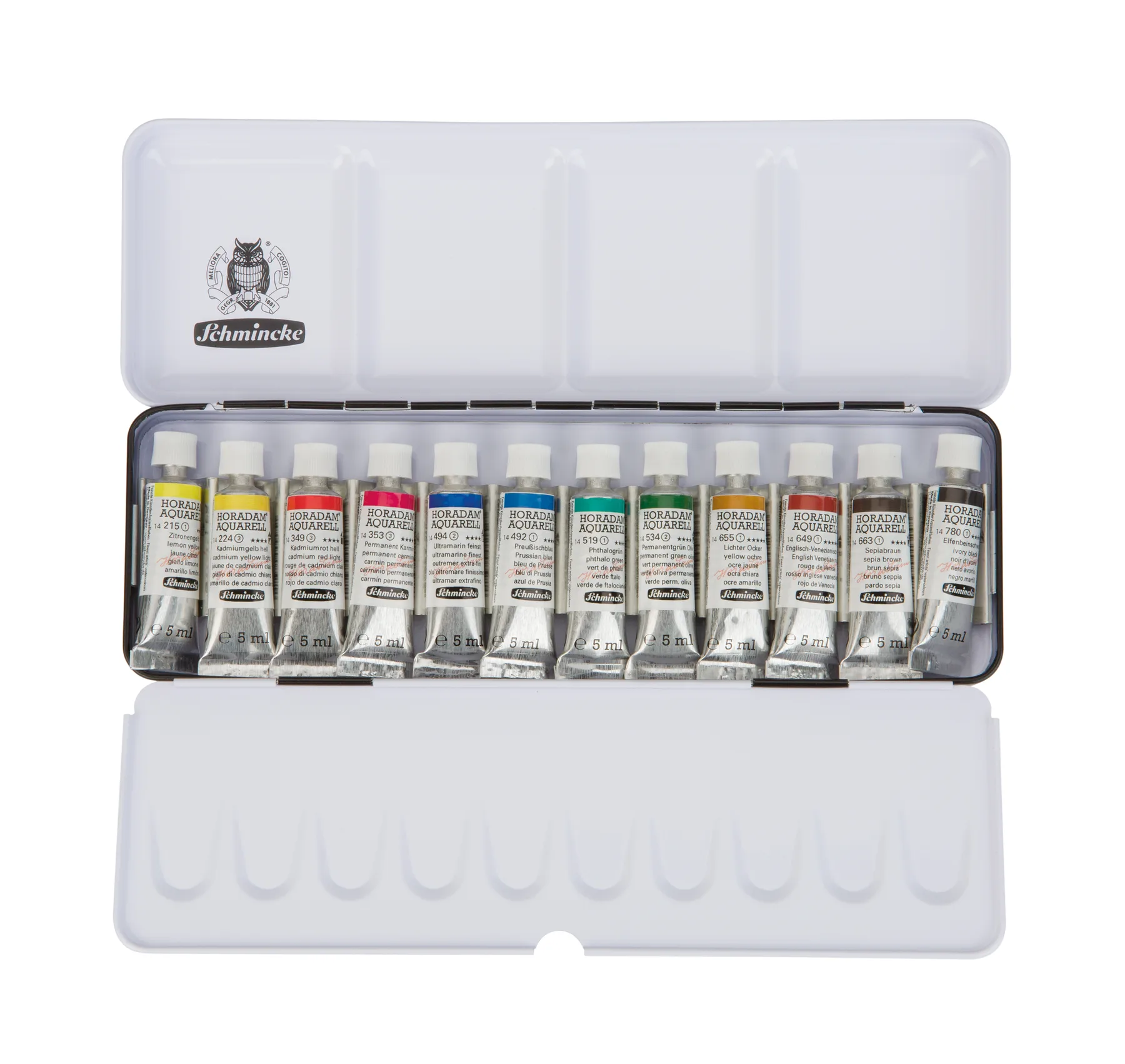Descubre la calidad superior del Set de Acuarela Horadam en pomos de Schmincke, que incluye 12 colores vibrantes de 5 ML cada uno.
