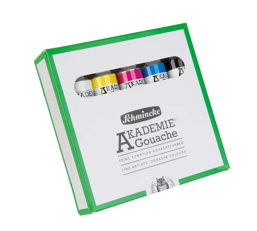 Descubre el Set Akademie Gouache de Schmincke, que incluye cinco tubos de 20 ml cada uno, que contienen colores primarios en formato CMYK.