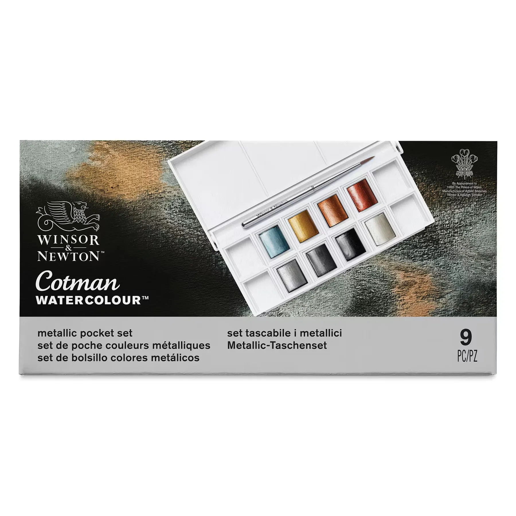 Las acuarelas Winsor & Newton Cotman ofrecen la calidad por la que la marca es conocida a un precio accesible. Elaboradas con pigmentos tanto tradicionales como modernos —desde tierras naturales hasta compuestos orgánicos—, estas acuarelas ofrecen una amplia gama de efectos, desde tonos suaves y fáciles de aclarar hasta matices más intensos y expresivos. La mayoría de los colores son transparentes, y su textura uniforme en toda la gama hace que las acuarelas Cotman sean especialmente adecuadas para principiantes.Este set incluye ocho pastillas de pintura metálicas en azul iridiscente, oro amarillo, bronce, cobre rojo, plata, peltre, negro iridiscente y blanco iridiscente, además de una brocha de viaje y espacio para cuatro colores adicionales.
