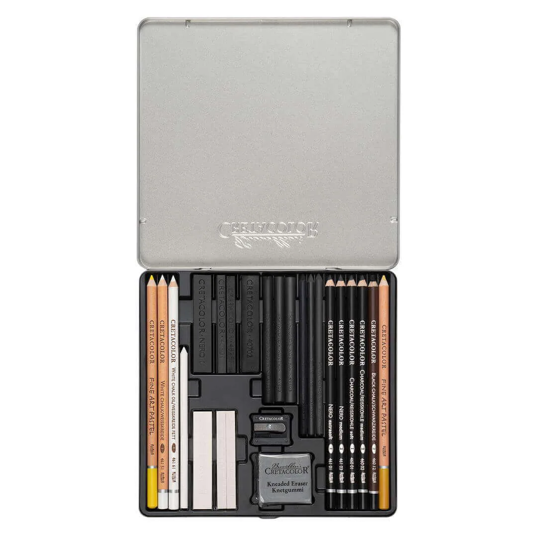 Este maravilloso set contiene:- Lápices para artistas Creta blanca (suave, graso suave)- Mina para artistas blanca, blanda- Barrita para artistas creta blanca, 7 x 14 mm, seca, suave- Pasteles (blanco, negro)- Barrita Nero, 7x7 mm.- Barrita Nero, 7x14 mm, extra suave- Carbón para croquis, 7x14 mm, 72 cm de largo- Carboncillo artificial ( suave, medio, duro)- Mina para artistas Creta negra, medio- Mina para artistas carboncillo, medio- Lápices para artistas Nero, (extra suave, medio)- Lápices para artistas carboncillo (extra suave, medio)