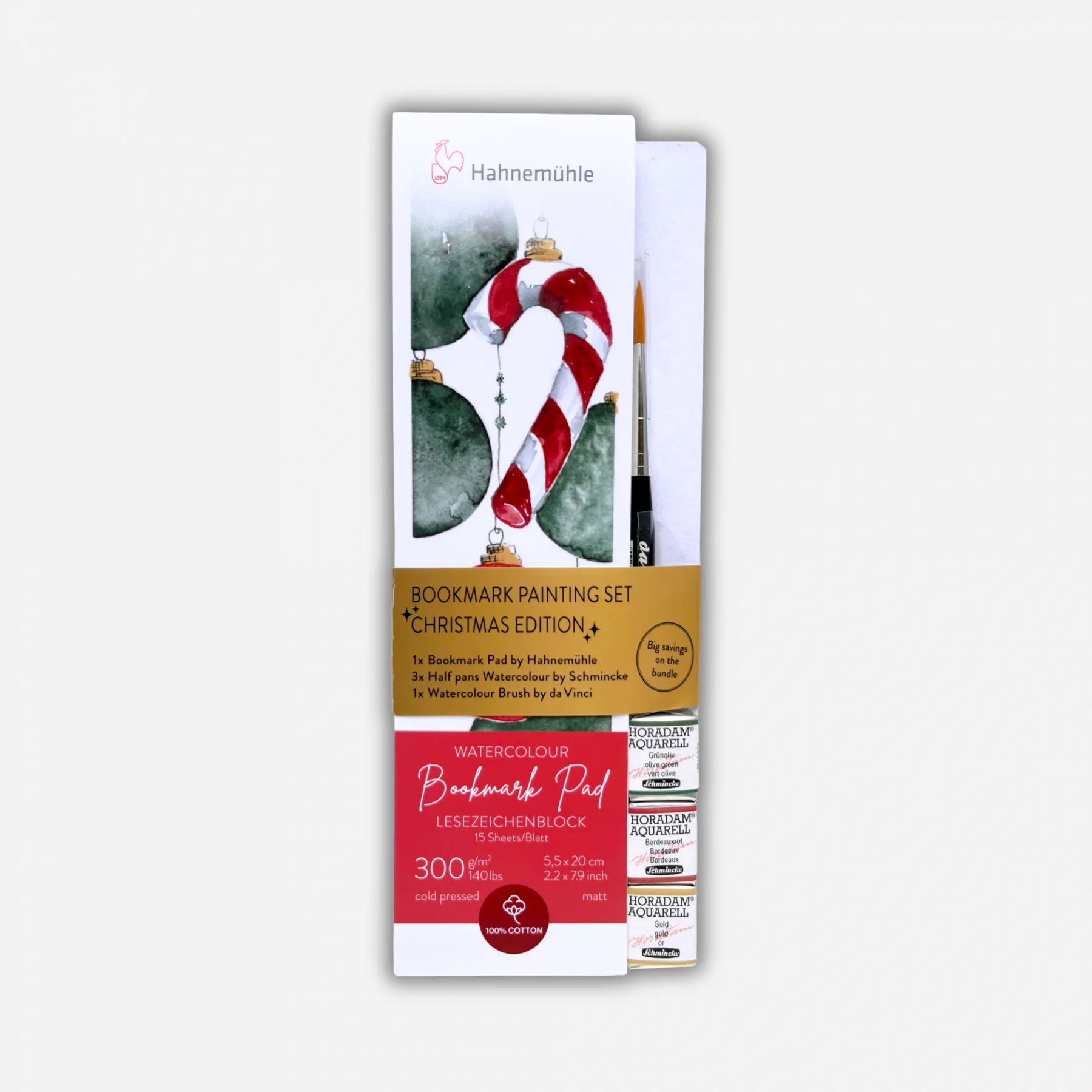Este práctico set está compuesto por:3 medias pastillas para acuarela, línea Horadam de la marca Schmincke1 pincel para acuarela de la marca Da Vinci1 block de 15 hojas para acuarela de 5,5 x 20 cmEste bloc de papel está diseñado especialmente para crear marcapáginas únicos y personalizados. Con un gramaje de 300 gramos, su consistencia permite un manejo fácil y duradero, perfecto para el uso diario.